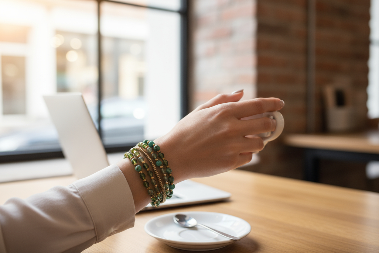 African Turquoise, Czech Glass, and Brass Heishi Five -Strand Bracelet