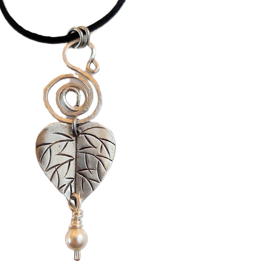 Silver-fill Spiral, Hill Tribe Silver Leaf & Swarovski Crystal Pearl Pendant Necklace OOAK