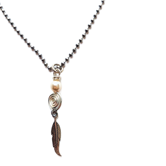 Silver-fill Spiral, Swarovski Crystal Pearl and Sterling Silver Feather Pendant Necklace OOAK