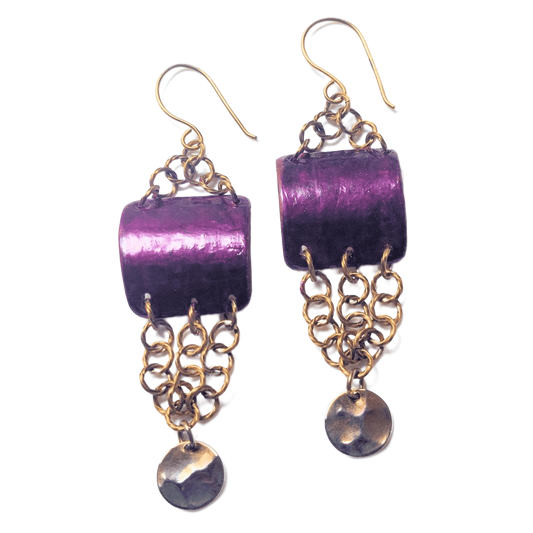 Vibrant Grape Hand Painted Birch Bark & Twisted Brass Earrings OOAK