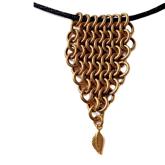 Brass Chain Maille Leaf Pendant with Petite Gold Leaf Drop Necklace