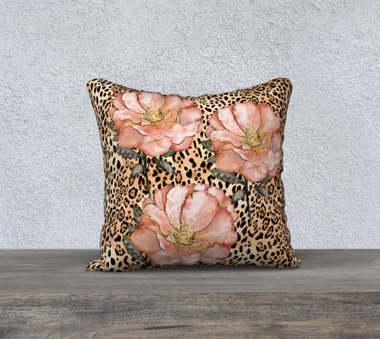 Pink Roses on Leopard Print Velveteen Pillow Cover - 18" x 18"