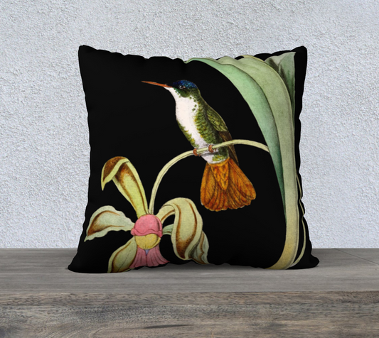 Vintage Hummingbird on Black Velveteen Pillow Cover - 22" x 22"