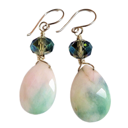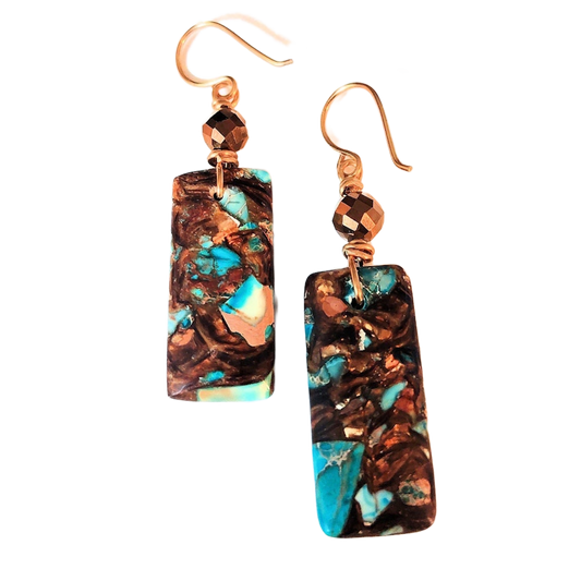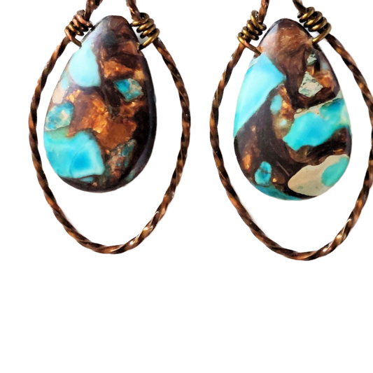 Teal Impression Jasper & Bronzite Teardrop in Twisted Wire Frame Earrings