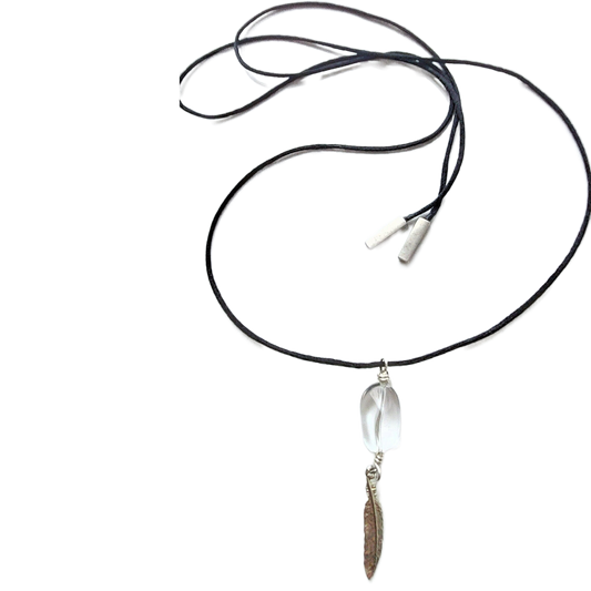 Polished Crystal Quartz & Silver-plated Pewter Feather Pendant Necklace