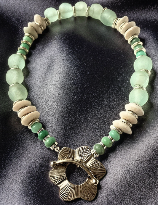 African Ashanti & Krobo Recycled Glass Beads with Amazonite Rondelles Choker Necklace