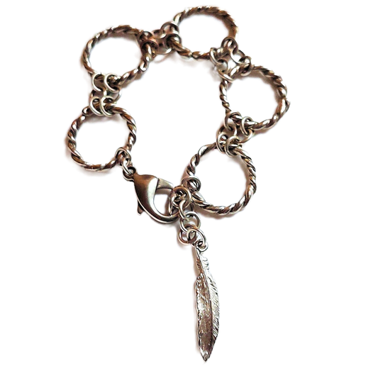 Silver-plated Pewter Rope Rings Bracelet with Feather OOAK