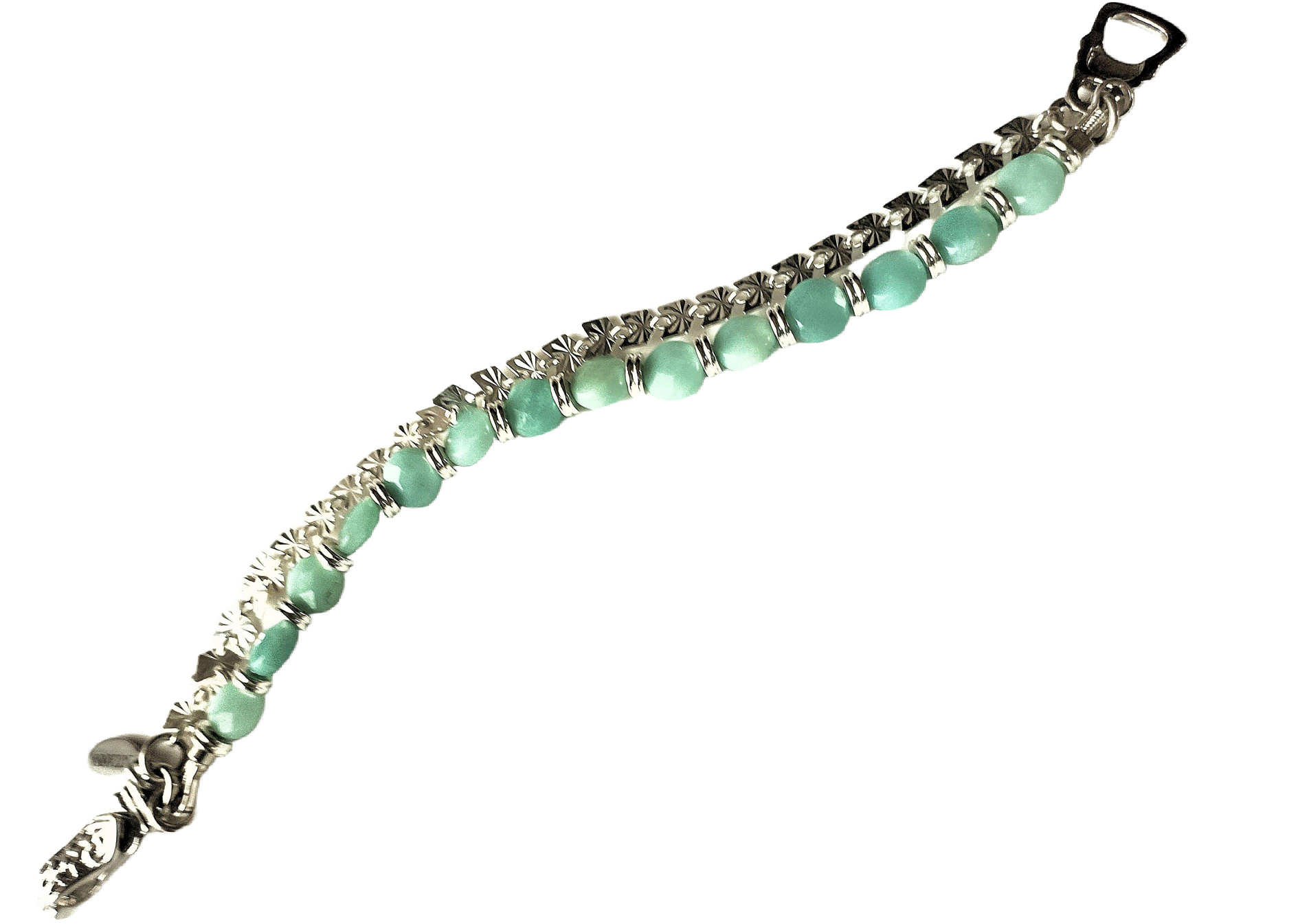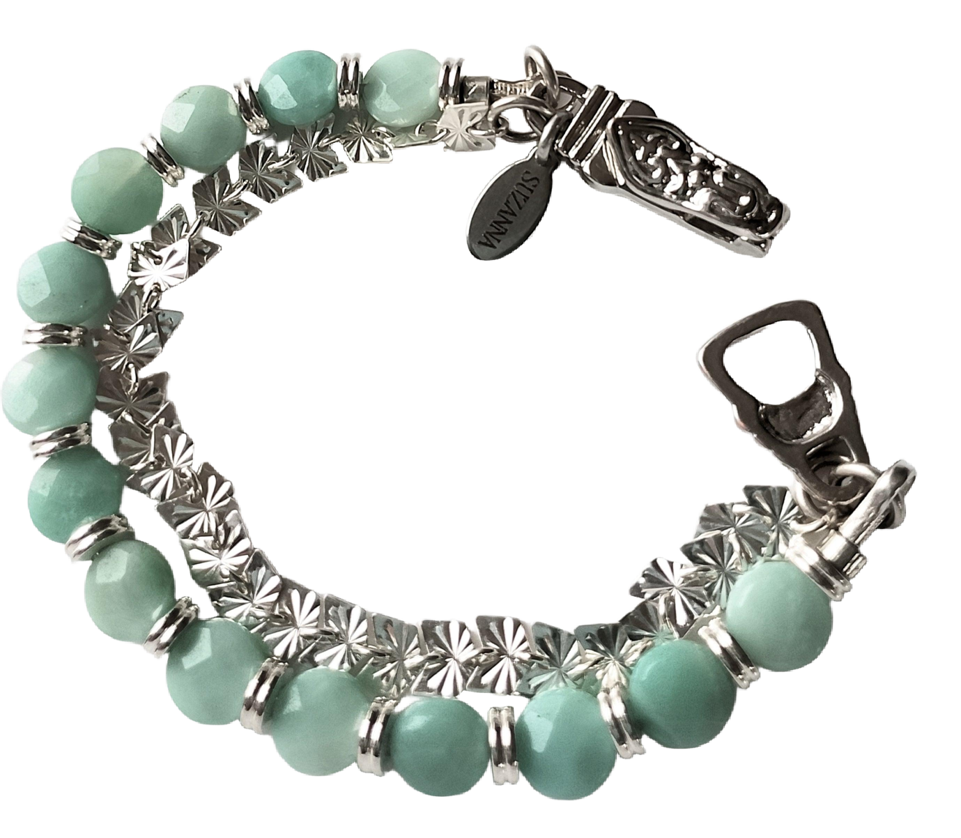 Get ready to take your fashion game to the next level with our stunning Amazonite Faceted Coin Bead & Sterling Silver Butterfly Chain Two-Strand Bracelet! This eye-catching accessory seamlessly transitions from daytime chic to evening glam. Featuring 14-8mm Amazonite faceted coin beads, accented with shiny silver-plated brass spacers, and a second strand made of sterling silver butterfly chain, this bracelet is anything but ordinary. To top it off, the bracelet is completed with a gorgeous rhodium fold-over magnetic clasp, meticulously handcrafted in Germany by the renowned company Claspgarten. And don't forget our SUZANNA silver jewelry tag, the perfect finishing touch to this one-of-a-kind piece.