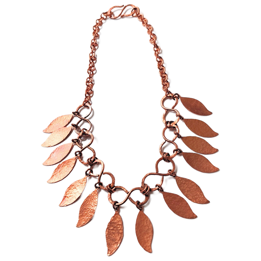 14 pretty copper leaf charms dance on a chain of seven infinity-shaped (figure 8) components handmade from heavy gauge copper, all hammered for sparkle and textural interest in this one-of-a-kind necklace. The handmade infinity chain and leaves showcase a rich natural patina contrasting the unoxidized 1-in-1 chain which will darken with time.