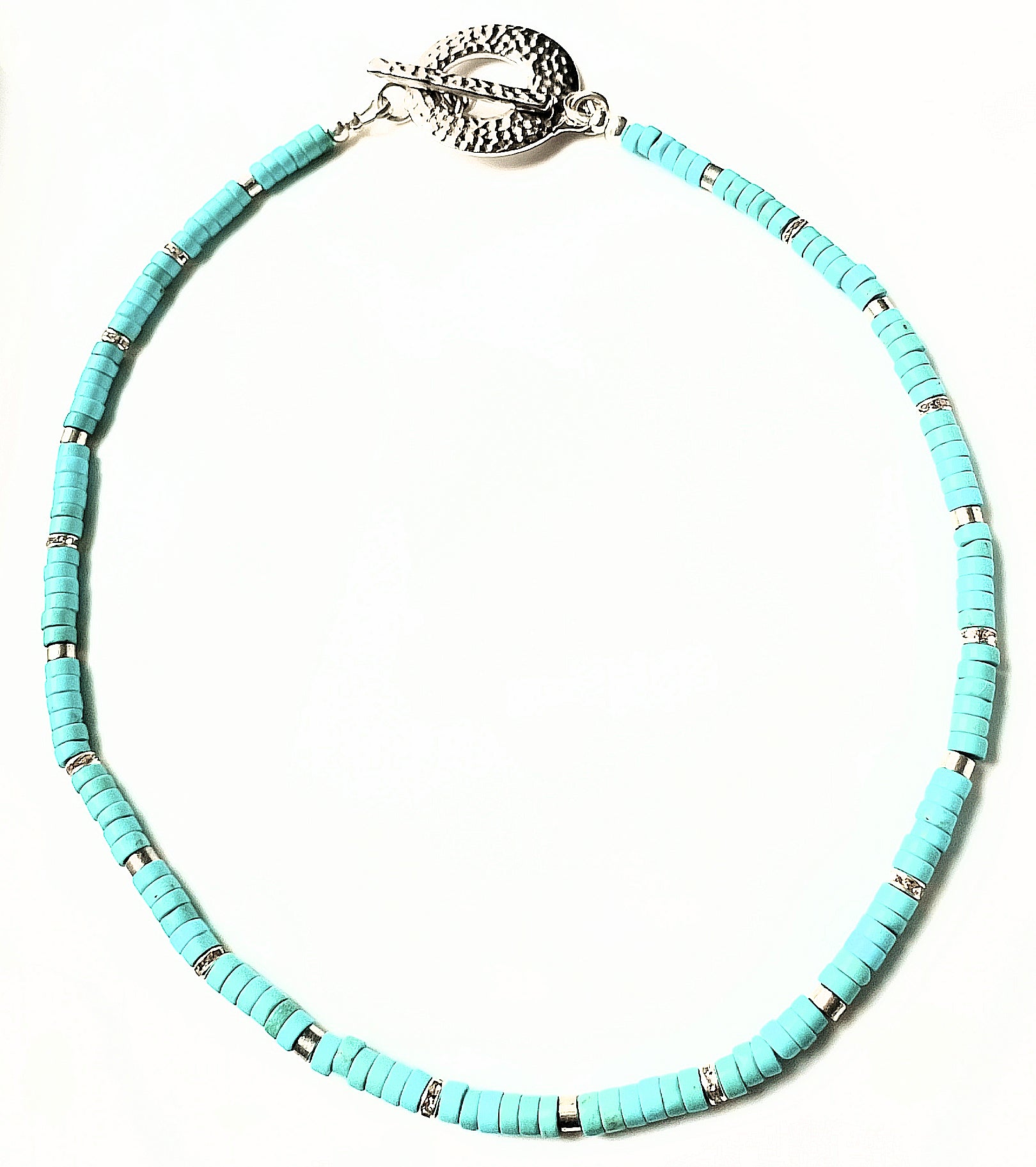 Our Natural Turquoise Heishi Choker Necklace with Rhinestone Spacers & Hammered Toggle Clasp Focal is a simple yet striking addition to your everyday jewelry wardrobe. Showcase the beautiful hammered TierraCast toggle clasp in the front of your neck as the focal, or wear it at the back or side of the neck. Pair it with jeans and a tee, or add a pop of colour to your business attire. Either way, this necklace complements a multitude of looks, and turquoise remains one of the most beloved gemstones.